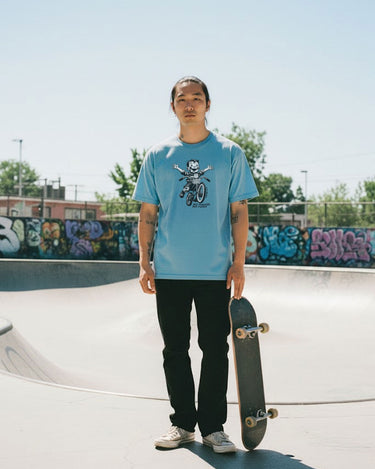 Esta prenda ha sido diseñada en España y confeccionada en una fábrica en Barcelos (Portugal) de forma ética y sostenible. La camiseta de manga corta en color azul cielo tiene un cuello redondo y un corte recto, perfecta para cualquier ocasión. Con un diseño unisex y estilo streetwear, esta camiseta muestra a un niño aprendiendo a montar en bicicleta a su manera. El modelo en la imagen mide 1,80 metros y lleva una talla M.